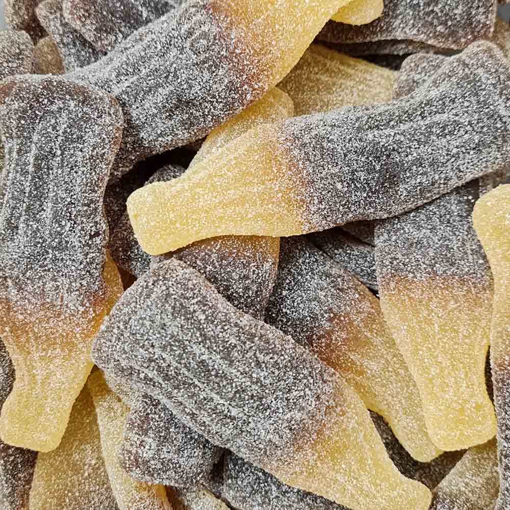 Jumbo-sized sour cola bottle gummies with a tangy twist. Bursting with classic cola flavour and a sour sugar coating.